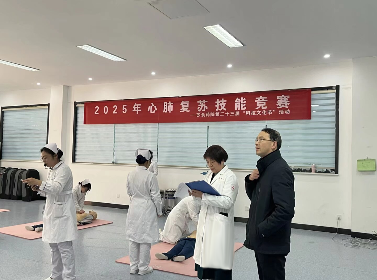 为全面普及应急救护知识,切实提升学生的急救实操能力与自救互救意识,12月4日,护理学院在实训中心举办以“人人学急救,急救为人人”为主题的“心肺复苏”技能大比武活动,实验实训管理中心孙芝扬书记到现场指导。